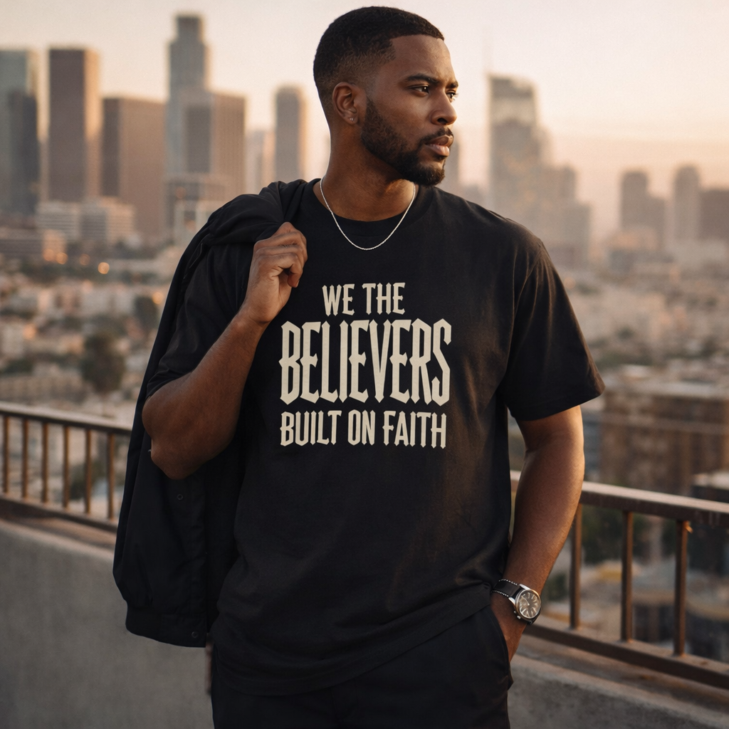 The We The Believers – Built On Faith tee carries heritage energy with modern street presence. Designed in bold Blackletter typography, the vintage cream ink against deep black creates a timeless contrast that feels historic, grounded, and unapologetic.
